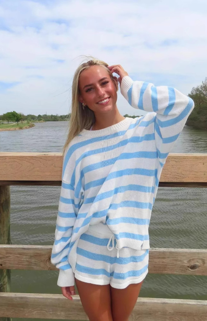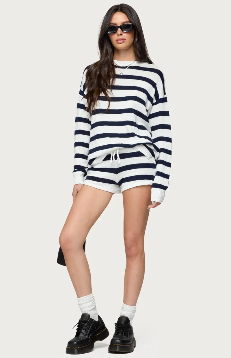 The oversized striped sweater pairs with high-waisted drawstring shorts for the perfect cozy-chic balance. The fit is flattering and forgiving, giving you that effortless “I look good without trying” vibe.